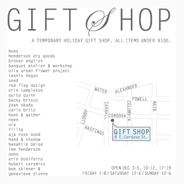 Beginning the next day, December 3rd, Aja will be debuting her soft-sculpture cakes at the Mono Clothing Gift Shop. The offspring of Claus Oldenburg and Martha Stewart, these cakes are each subtly different with their own distinct scent made from natural spices, herbs and oils. A curated temporary store featuring objects, art & accessories, each item priced $100 & under, the Gift Shop will be open Fridays 1 – 8, Saturdays 12 – 6 & Sundays 12 – 6 from December 3rd – December 17th at 8 E. Cordova St. @ Carrall.