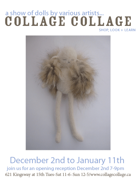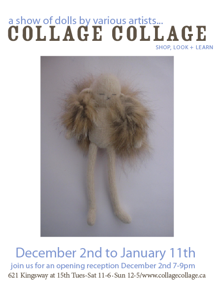 Aja Rose Bond will be busy this December selling crafts, sculptures & books at three different Vancouver venues. Firstly, at Collage Collage she’ll be exhibiting her 4 anonymous dolls that made their first appearance as part of the STAG’s premier exhibition. Each doll is a unique blend of clay, paint, textiles and paper. They’ll be part of a group show devoted to dolls opening Thursday, December 2nd from 7-9pm.