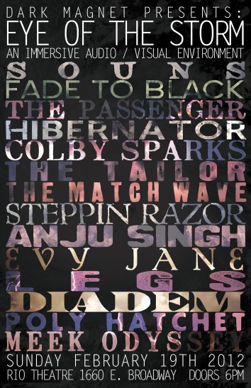 Sunday February 19th 2012, at the Rio Theatre, this event combines the finest in live PA ambient/drone/no tempo music on a big soundsystem, with a visual component from each artist on the 40′ x 20′ silver screen. This is going to be a deep, immersive, environment created for the listening and viewing pleasure of all audio and video connoisseurs.