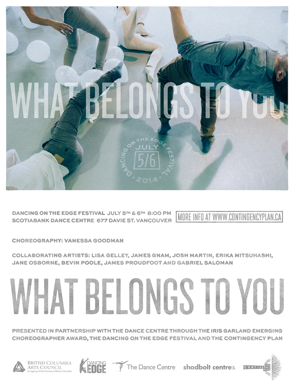 The Dance Centre through the Iris Garland Emerging Choreographer Award, The Dancing on the Edge Festival and The Contingency Plan